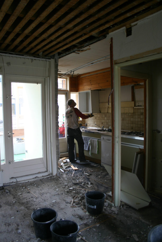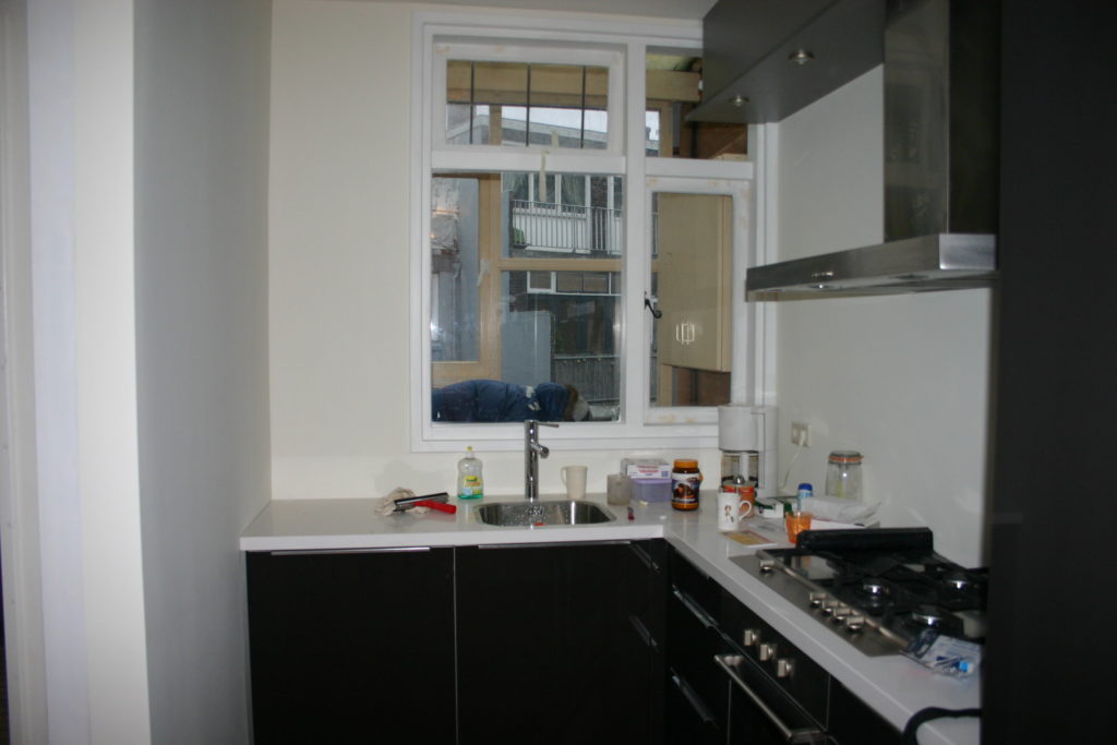 Van deze gesloten keuken hebben wij een moderne open keuken gemaakt. Na het strippen bleek er betonrot in het plafond en een vochtprobleem in de muur. Beiden hebben wij vakkundig gerepareerd. Tevens zijn wanden geïsoleerd. Alle leidingwerk is vervangen. De doorbraak naar de woonkamer geeft een mooie open keuken. De deur naar het balkon was niet meer noodzakelijk. Door hier een raam van te maken, bleef er voldoende ruimte voor aanrechtblad over. De deur naar de gang was ook niet meer noodzakelijk. Hier is een inbouwkast van gemaakt.